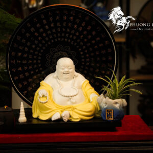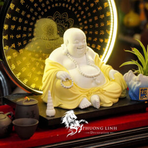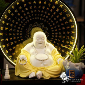 Khác với dáng đứng, hình tượng Phật Di Lặc ngồi (tọa thiền) mang đến cảm giác vững chãi, ung dung và tự tại tuyệt đối. Với nụ cười hoan hỉ xua tan mọi ưu phiền và sắc vàng sang trọng, kết hợp cùng ánh sáng đèn LED huyền ảo, tác phẩm là điểm nhấn tâm linh đắt giá, mang lại sự ấm cúng và vượng khí cho không gian thờ tự hoặc trang trí.