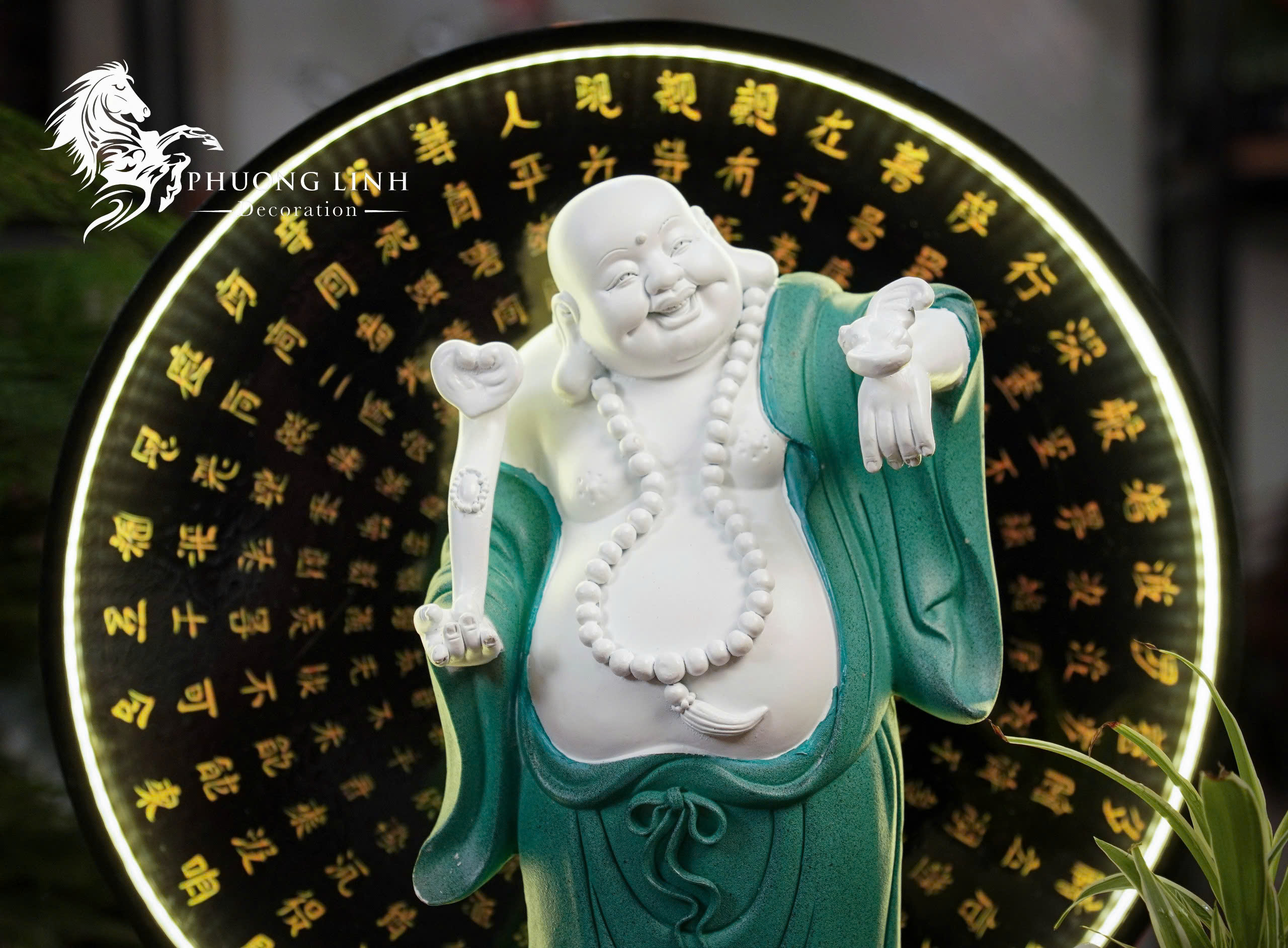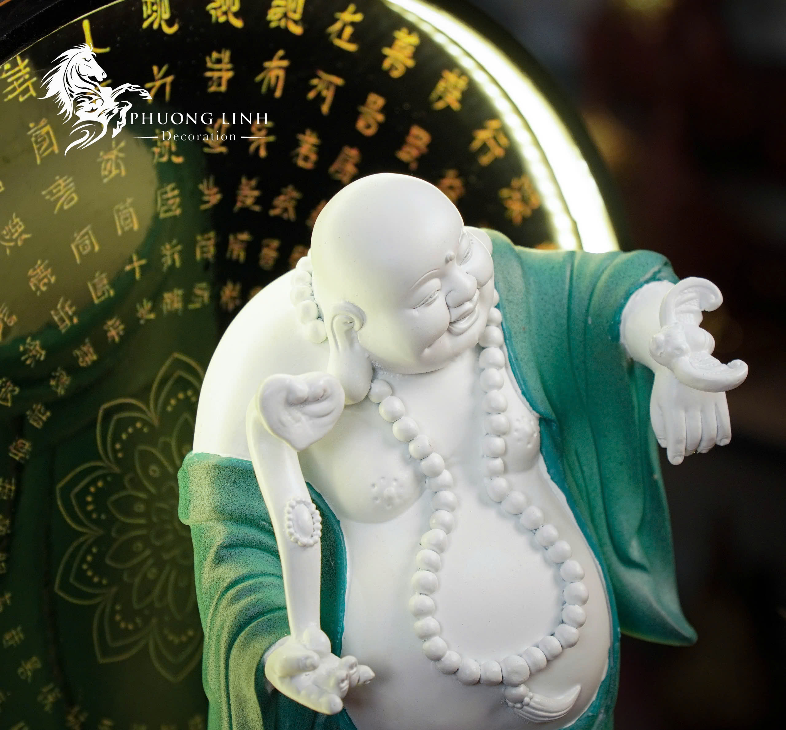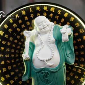 Sản phẩm là sự kết hợp hoàn hảo giữa nghệ thuật điêu khắc và ánh sáng. Tượng Phật Di Lặc với nụ cười hoan hỷ, thần thái an nhiên nổi bật trên nền vòng đèn LED hào quang khắc kinh Phật phía sau. Đây không chỉ là vật phẩm thờ cúng, trang trí mà còn là “liều thuốc tinh thần” mang lại cảm giác bình an, thư thái và sự ấm cúng cho không gian sống.