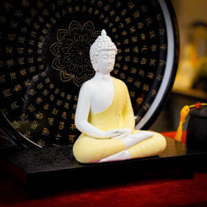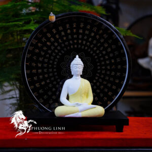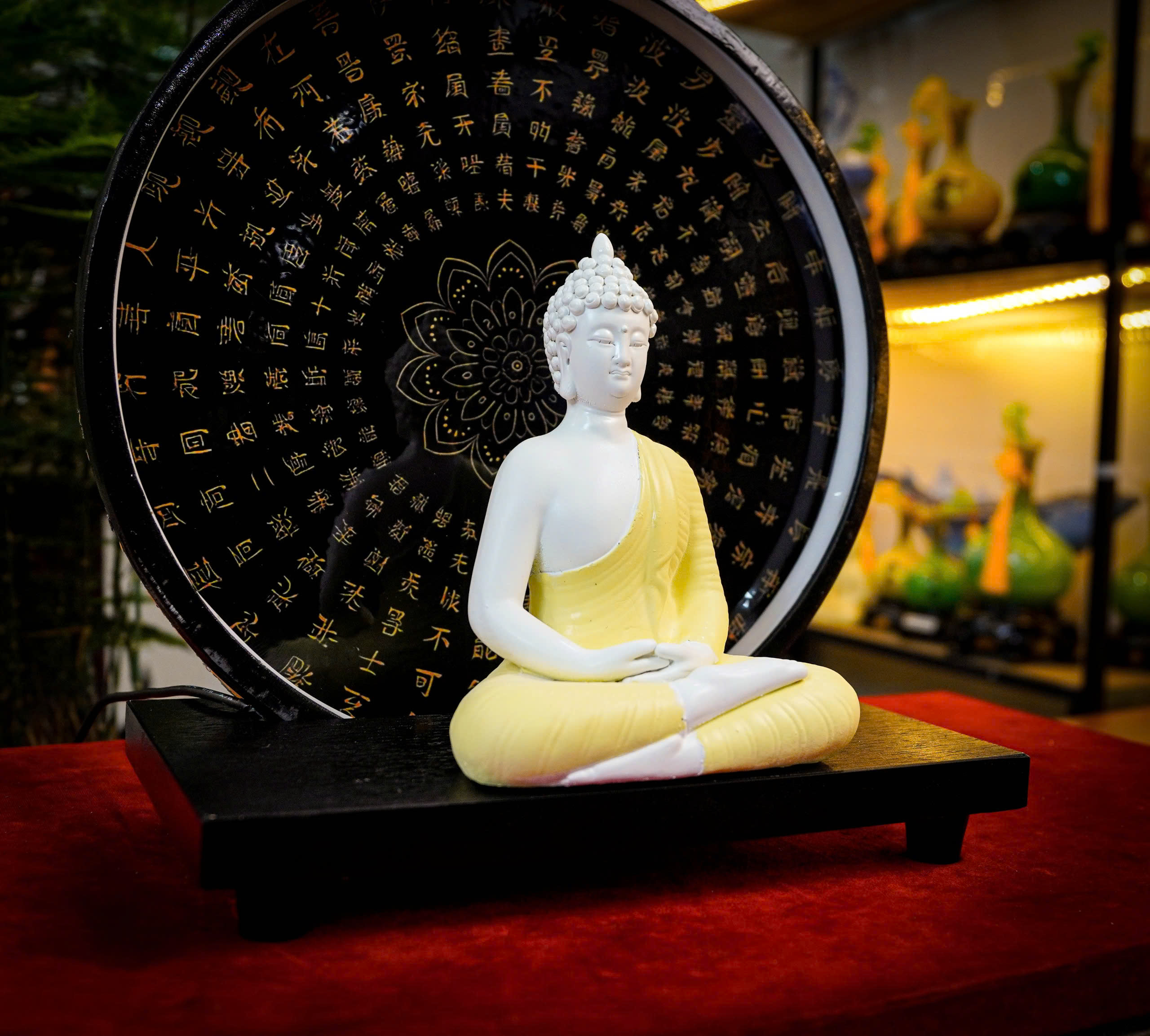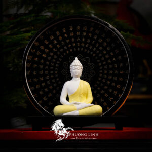 Bức tượng tái hiện hình ảnh Đức Thế Tôn (Phật Thích Ca) đang trong tư thế tọa thiền nhập định, thần thái uy nghiêm nhưng vô cùng từ bi. Sự kết hợp giữa tôn tượng trắng thanh khiết, y áo vàng trang nghiêm và vòng đèn LED hào quang khắc kinh phía sau tạo nên một không gian tâm linh huyền ảo, giúp người chiêm bái tìm thấy sự bình yên và sáng suốt trong tâm hồn.